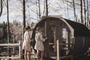 Som gäst på vårt hotell på landet kan du njuta av en avkopplande kväll i vår vedeldade bastutunna, vackert belägen intill vår lilla sandstrand och brygga, cirka en kilometer från hotellet. Du kan enkelt ta dig dit till fots eller med bil. När mörkret faller blir upplevelsen extra stämningsfull med den mysiga belysningen omkring.